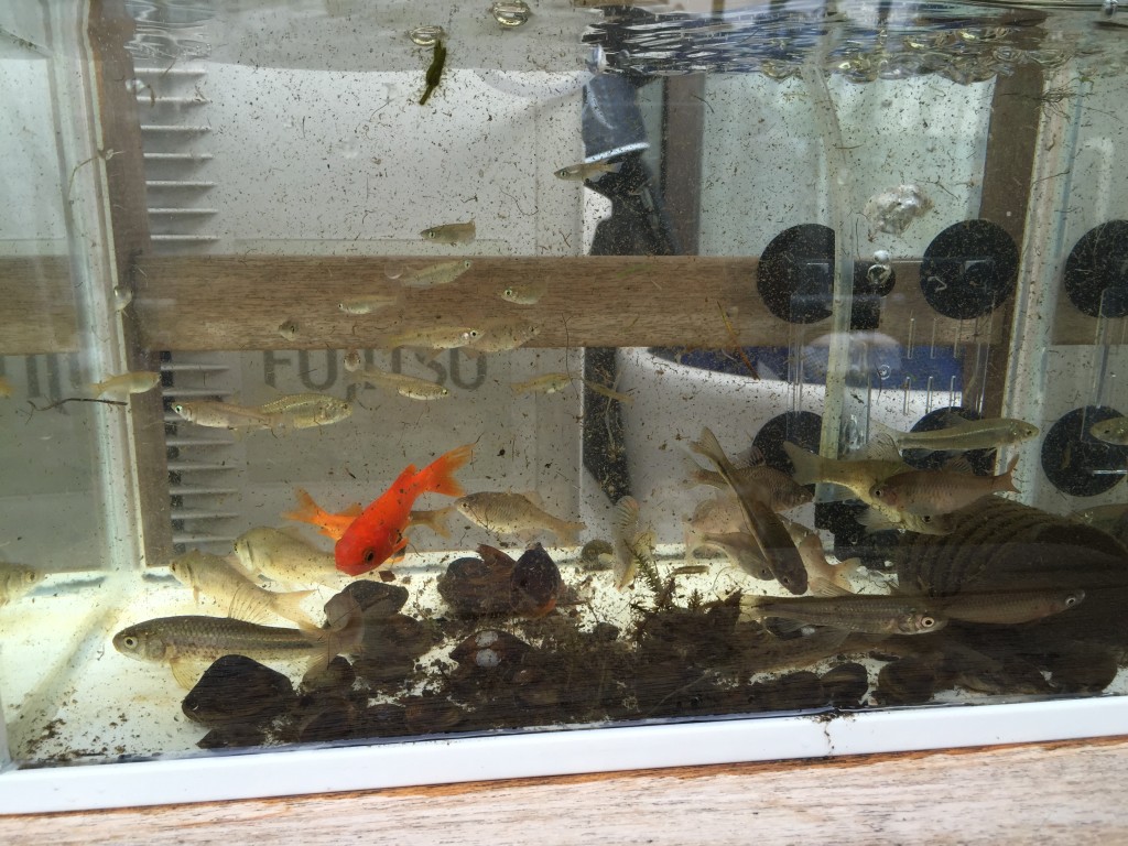 疎開先水槽にはこれだけの生き物が。クロメダカ、ヤリタナゴ、アブラボテ、タイリクバラタナゴ、タモロコ、モツゴ、ギンブナ、マドジョウ、マシジミ、タニシ。なんか、減ったなぁ。スジエビやヌマエビ、アブラハヤ、カワムツがいなくなった。こないだの祭りで子供たちが掬ってきた金着が新参者。違和感しかないぞ。