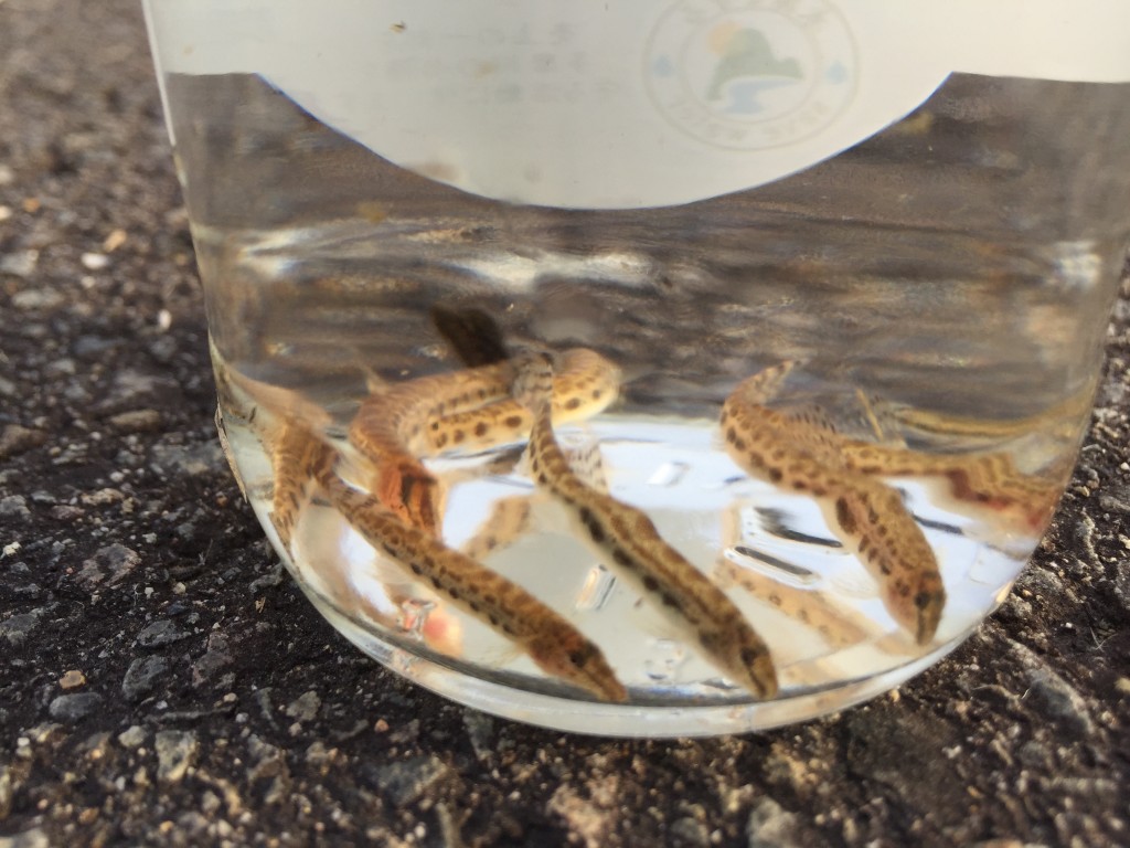 空いていたジュースの瓶に数匹入れて持ち帰りました。小さい生き物少しだったら、ペットボトルとかで十分ですね。