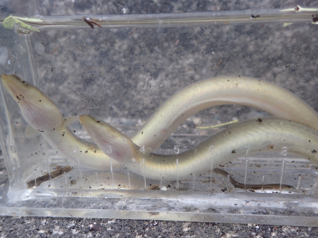 そしてそして、出ましたウナギ。普通は夜釣りや細長い専用の仕掛けで採りますが、そんな悠長なことはしたくないのでタモ網で攻めます。鰻丼のウナギは何度も見てるのに、生きてるウナギはあんまり見ることないですよね。このサイズは初めて採ったから興奮。この辺りの川でガサガサしていると川底に幾つもの仕掛けが沈めてあるのに遭遇します。