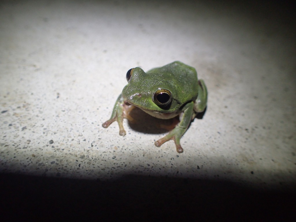 急いで帰ると、これまた急いで夕飯を食べ、子供たちを風呂に入れて寝かしつけ、カッパを着て長くつを履いてヘッドランプを装着し、小さな虫かごを手に、勇躍出かけた。もちろん、シュレーゲルアオガエルを捕まえるためである。
