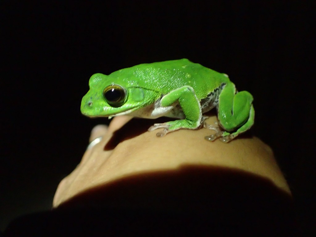 肺呼吸がメインだけど皮膚呼吸もするので体はいつも湿っています。だから、天敵に見つかりにくい雨の夜、カエル達がこぞって水辺を目指します。シュレーゲルアオガエルやモリアオガエルといった樹上生のカエルは、木から降りてくるこの時期にしか捕まえることができません。