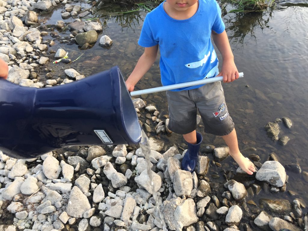我が家でも子供が川へ入りたがります。まだ小学生低学年なので深いところには入っていけないし、ウェーダーなんてありません。ではガサガサするとき、子供に何を履かせればいいか? 迷いどころですね。