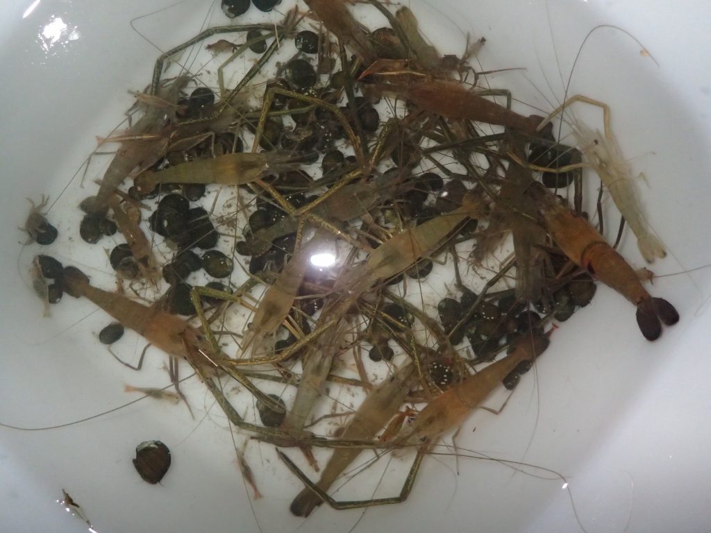 その他の持ち物は通常の道具と変わりないが、あると便利なのが「エビタモ」だ。テナガエビを取るための。専用のタモ網で竹の柄に直径15センチ程度の丸い網が付いている。網目は1.5センチほどあって、軽くて水の中で取り回しが良い。狙って取りやすいのだ。