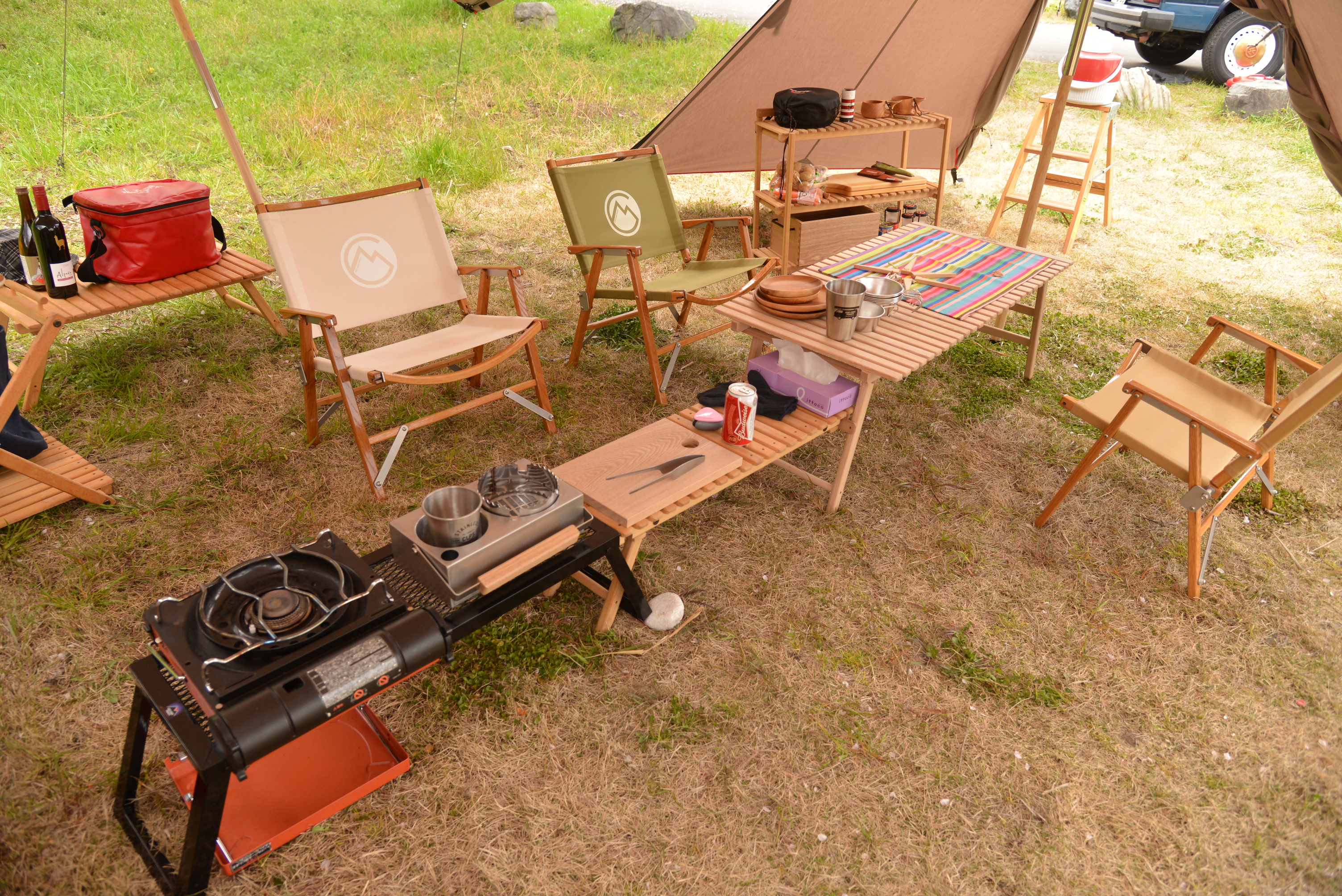 バーナースタンド、ランタンポールなどとりあえず必要なものが全て揃ったキッチンテーブルです。