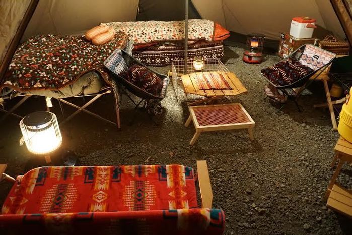 夏と違ってテントの中で過ごす時間が多くなりますので、棚を置いたりテーブルクロスをしたりと内装をオシャレに飾っても楽しいですね!