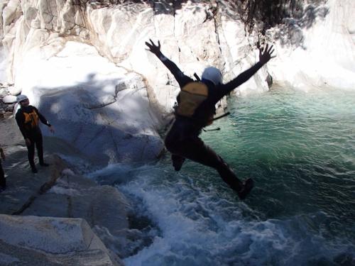 広葉樹の明るい木々と沢のセットは素晴らしく美しく、歩くだけでもウットリです。皆で歩いて、きつくなればエメラルドグリーンの流れを見ながらボンヤリ休憩し、退屈すれば、少し刺激を求めて、滝壺で泳いだり、飛び込んでみたり。道中だけで十分に楽しめます。